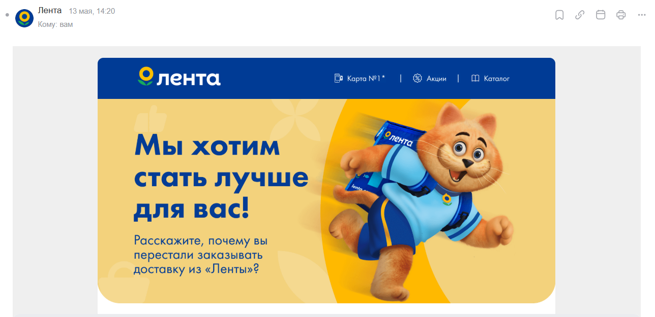 Лента присылает email-напоминания, если клиент долго не заказывал доставку из магазина