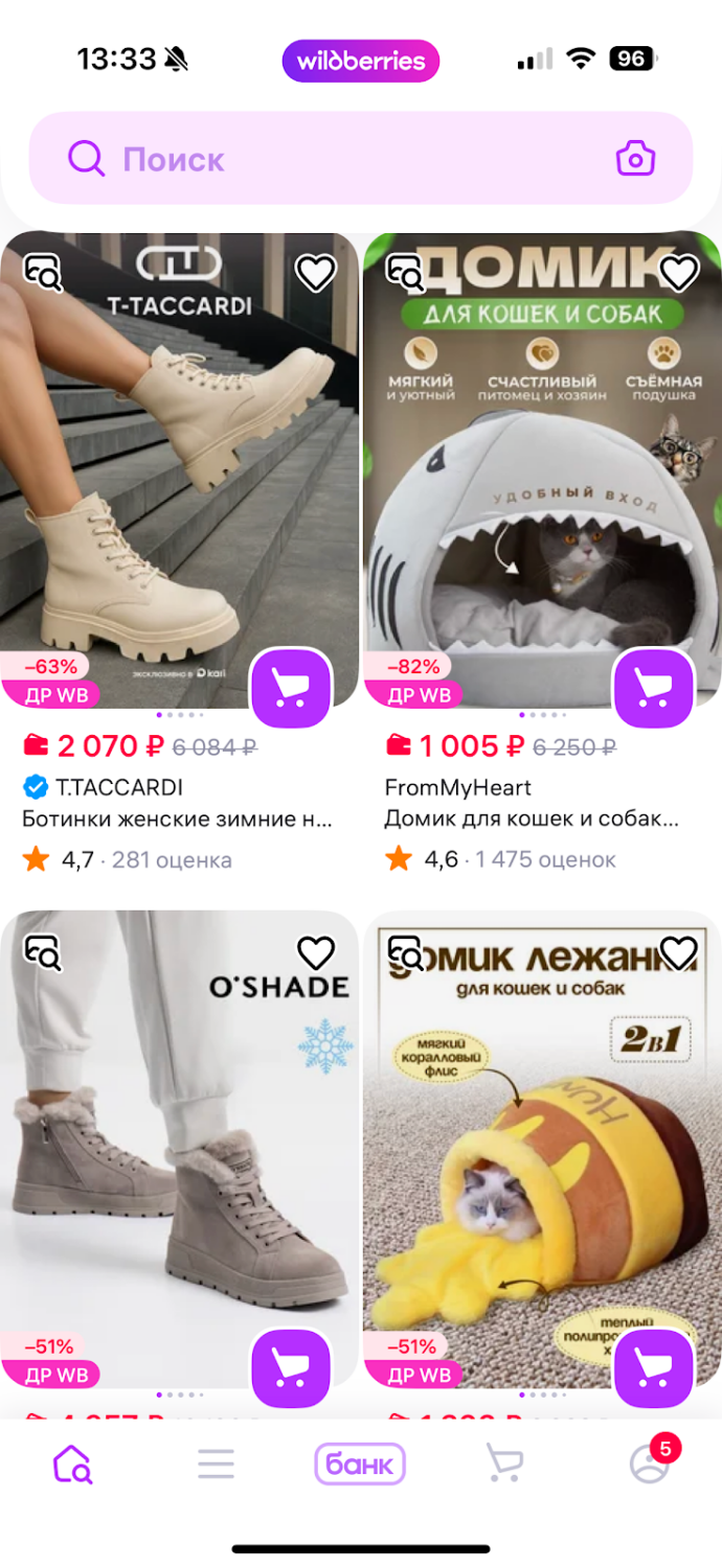 Один из примеров детальной персонализации — подборка Wildberries. Маркетплейс предлагает товары тех цветов и форм, которые нравятся пользователю