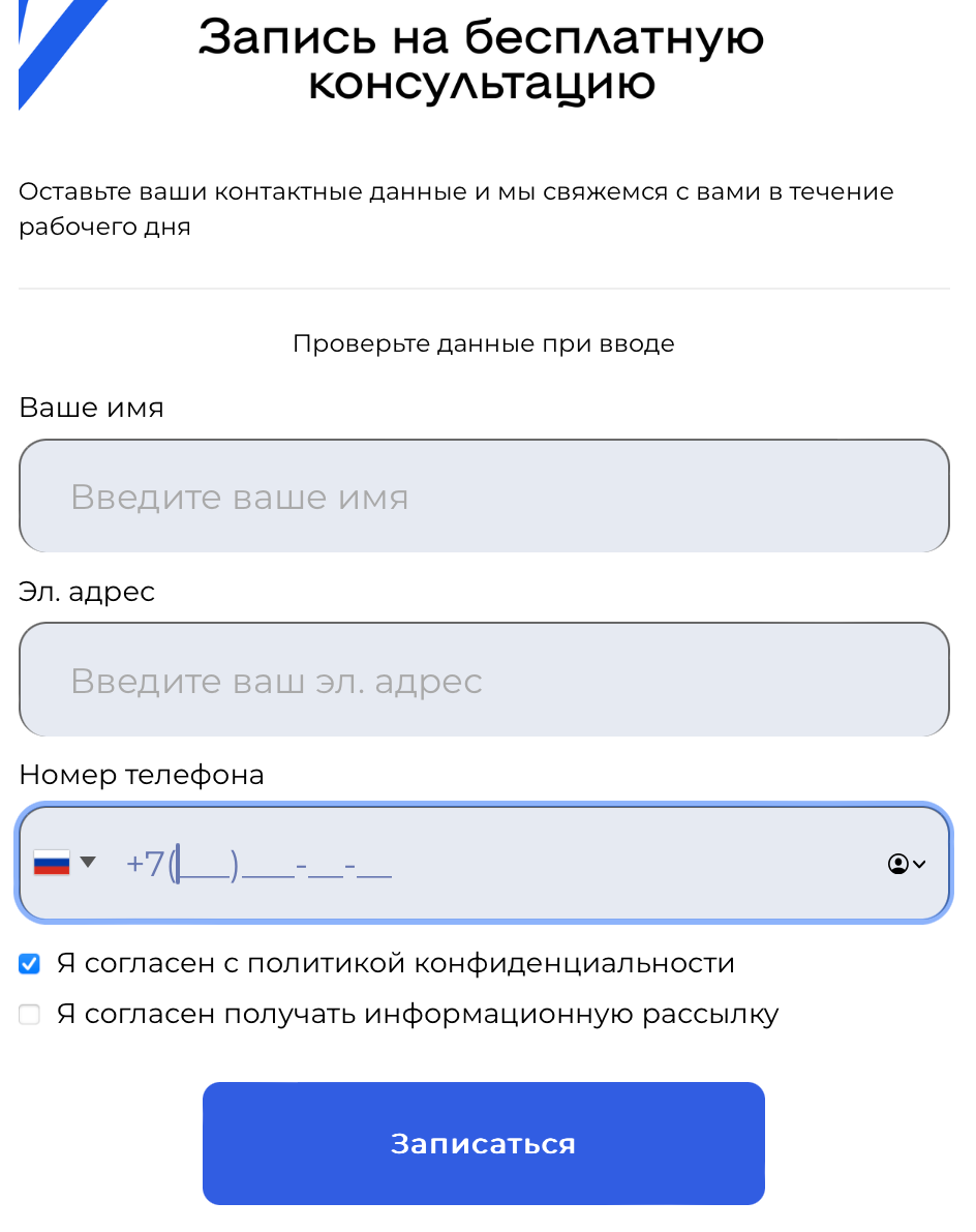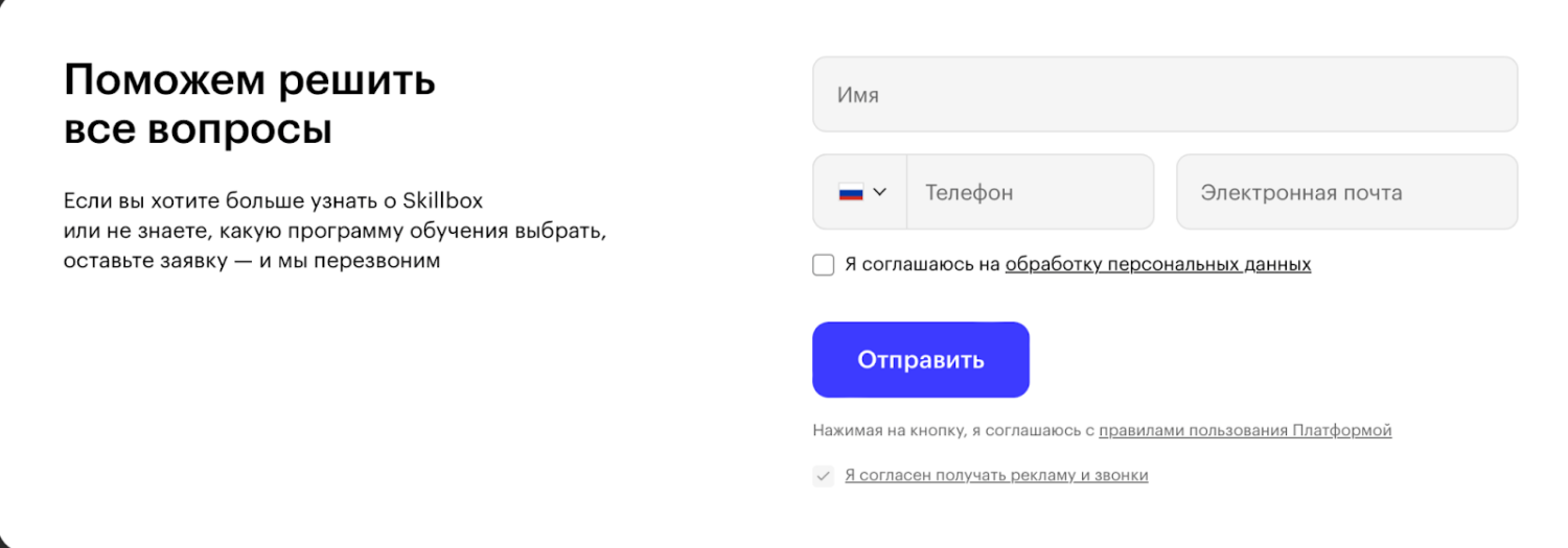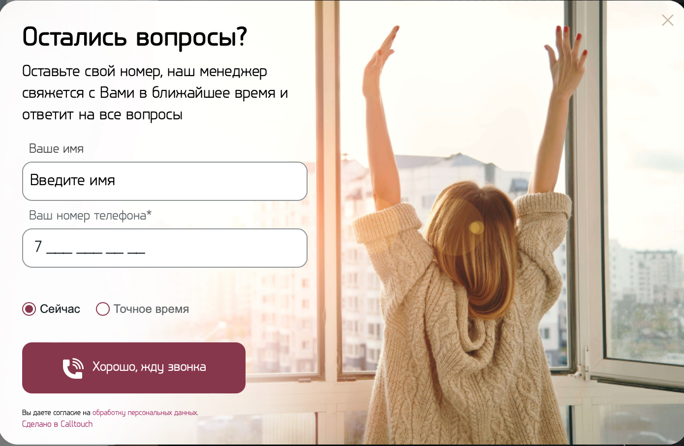 Пользователь оставляет номер телефона, а менеджер компании ему перезванивает. Специалист выявляет потребности и предлагает решение. Форма удобна для дорогих или сложных услуг и продуктов, где живое общение повышает конверсию в продажу.