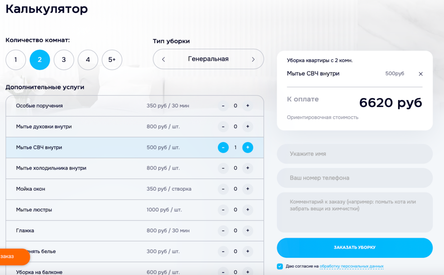 Пользователь указывает несколько показателей и получает расчет примерной стоимости услуг или товара. Это мотивирует его оставить контактные данные, чтобы уточнить детали.