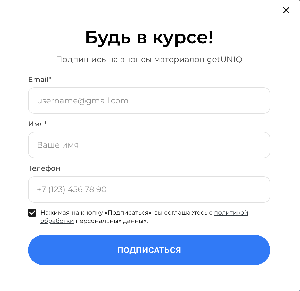 Стандартный вариант состоит из 2–5 полей и чаще всего находится внизу главной страницы сайта или в блоге компании. Также форма может проявляться в виде поп-апа.