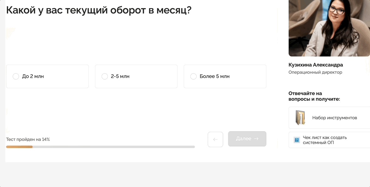 Пример квиза на сайте компании, которая выстраивает отделы продаж. Пользователь получает оценку своего бизнеса и предложение записаться на бесплатную консультацию
