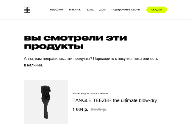Email-кампания для сегмента «просматривали товары, но не купили». Магазин напоминает пользователю о товарах, которые он изучал на сайте