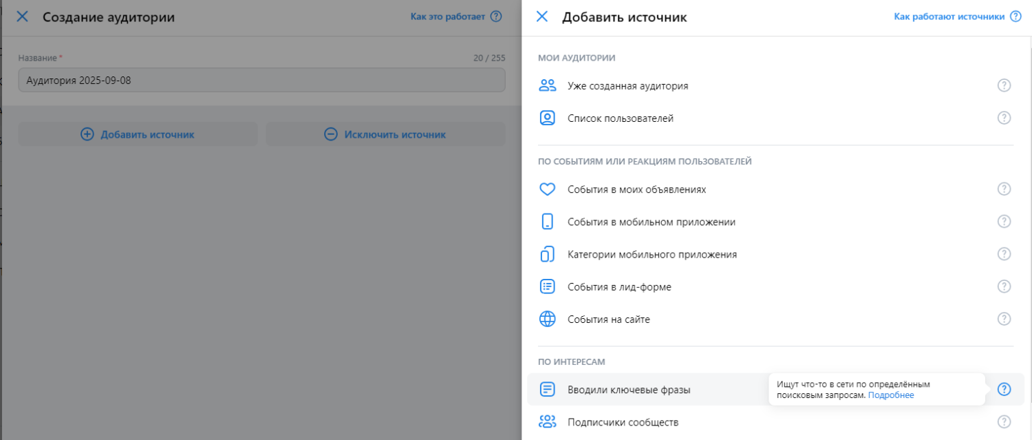 В кабинете «VK Рекламы» аудитории работают как конструктор: вы выбираете один или несколько источников данных и правила, по которым их сочетать