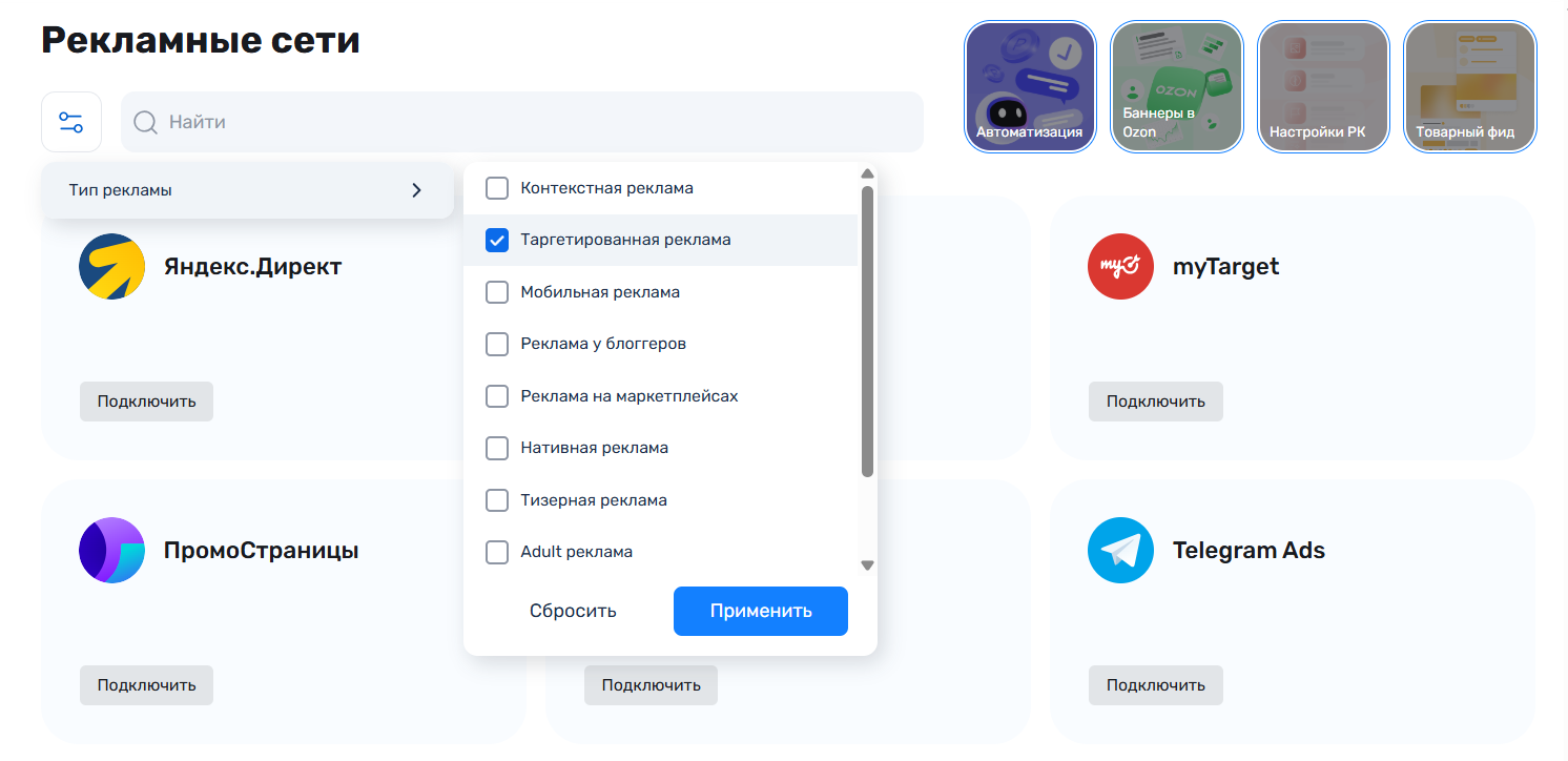 Это платформа для пополнения, управления и отслеживания статистики объявлений. Из единого кабинета вы сможете запустить объявления в любой рекламной сети и отслеживать их результаты. Это особенно удобно, если вы сравниваете эффективность одинаковых объявлений в разных рекламных сетях.